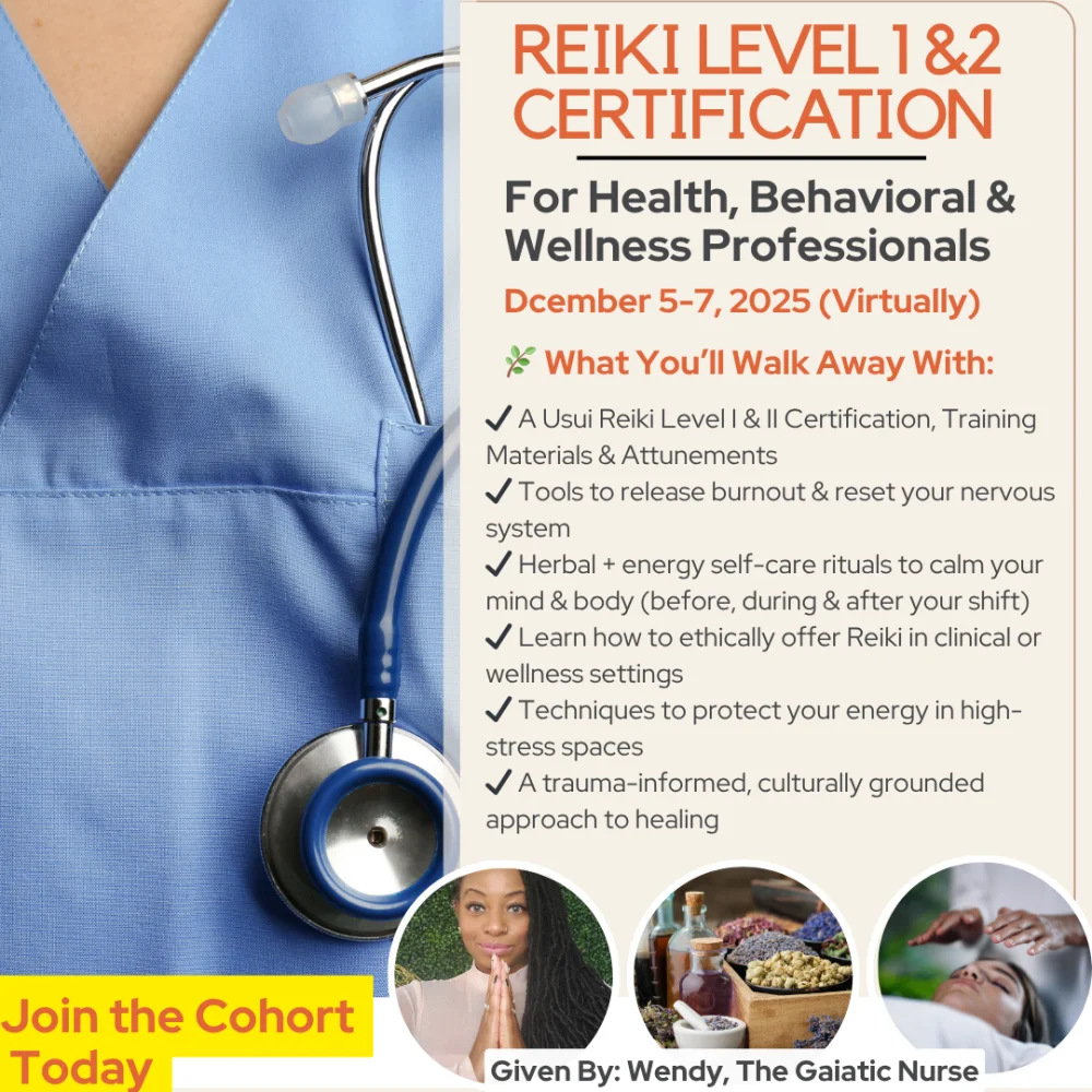 Gaiatic Reiki is the healing system I wish I had years ago. It blends traditional Reiki with herbal support, nervous system science, and soul-nourishing self-care rituals that help you calm your body, clear emotional tension, and reclaim your energy. It’s trauma-informed, culturally rooted, and designed for caregivers, empaths, and wellness professionals who are ready to finally care for themselves the way they care for everyone else.