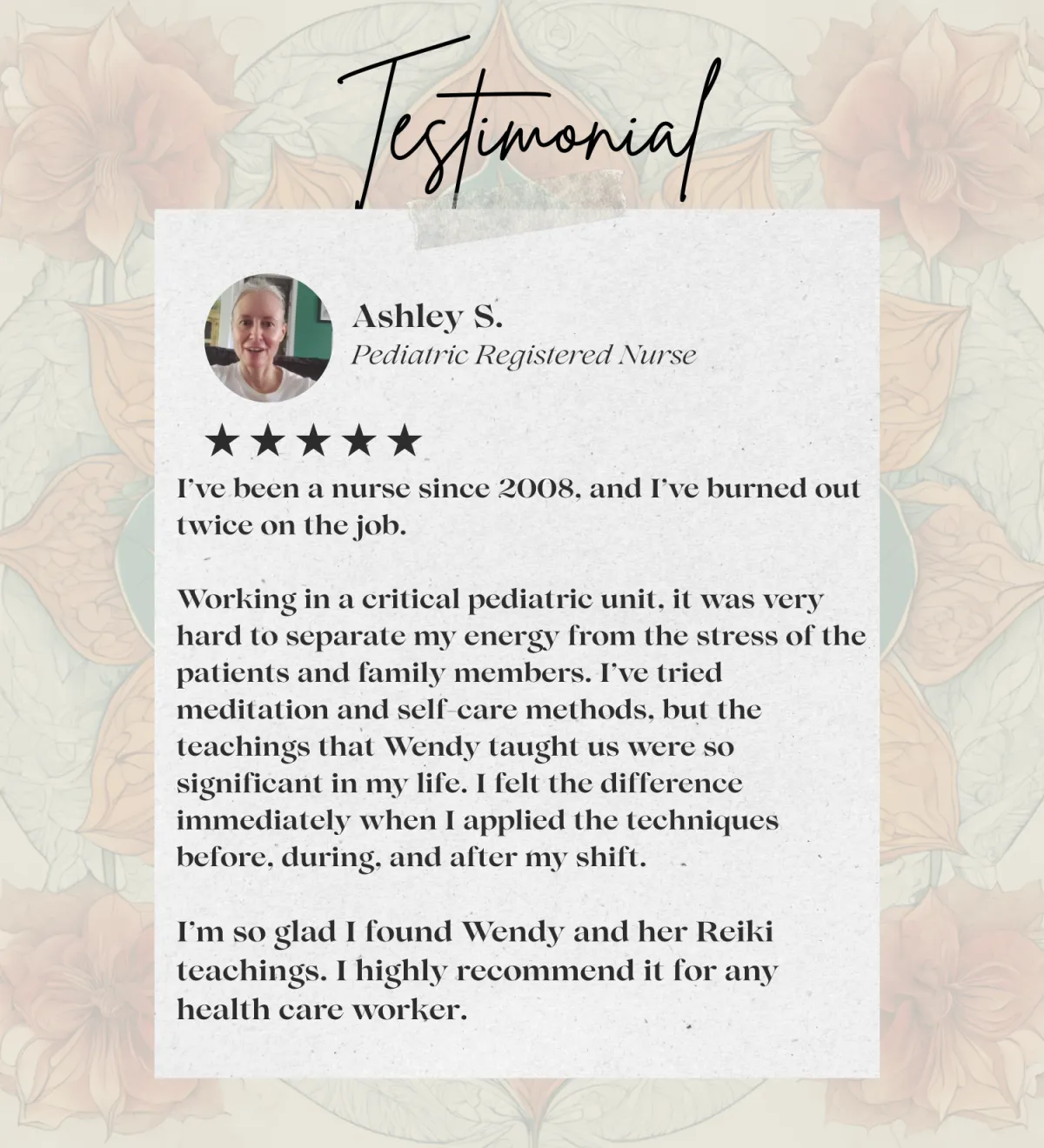 My program integrates Usui Reiki with trauma-informed stress education, herbal rituals, and nervous system science — offering both personal healing and professional application.